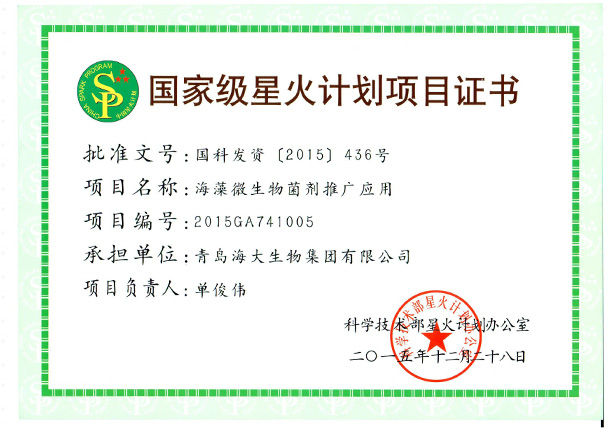 国家级星火计划项目证书