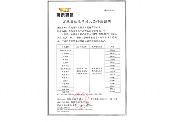 万泰有机生产投入品评价证明